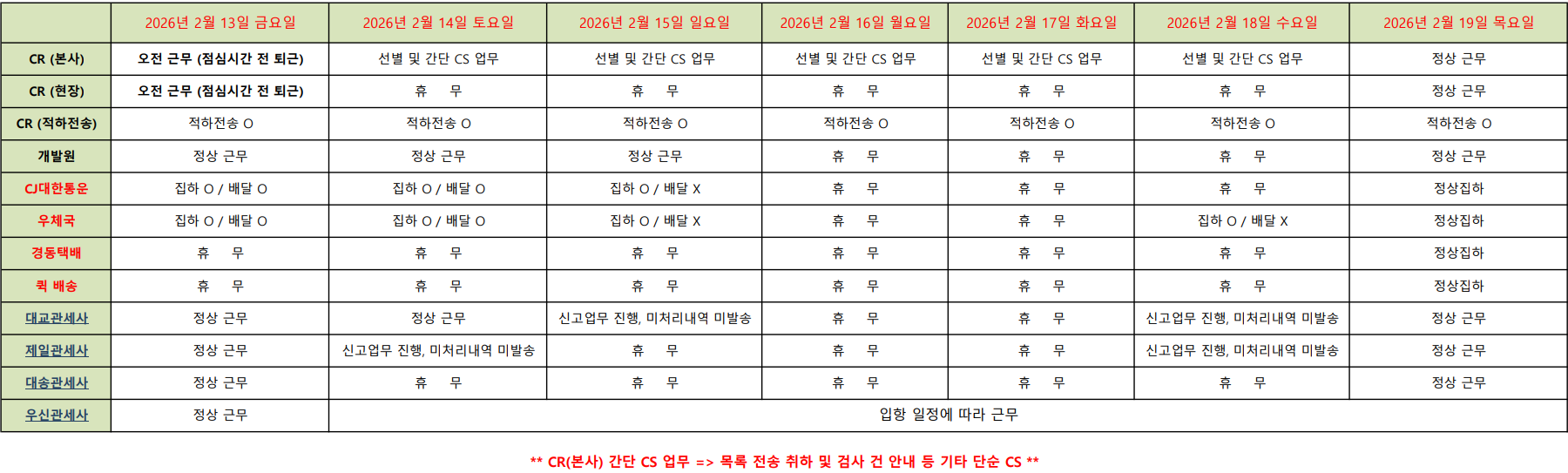 설날을 맞이하여 해당 연휴 일정 안내 드립니다. 참고 부탁드립니다. CA는 금요일 (2/13) 출고 가 없습니다.